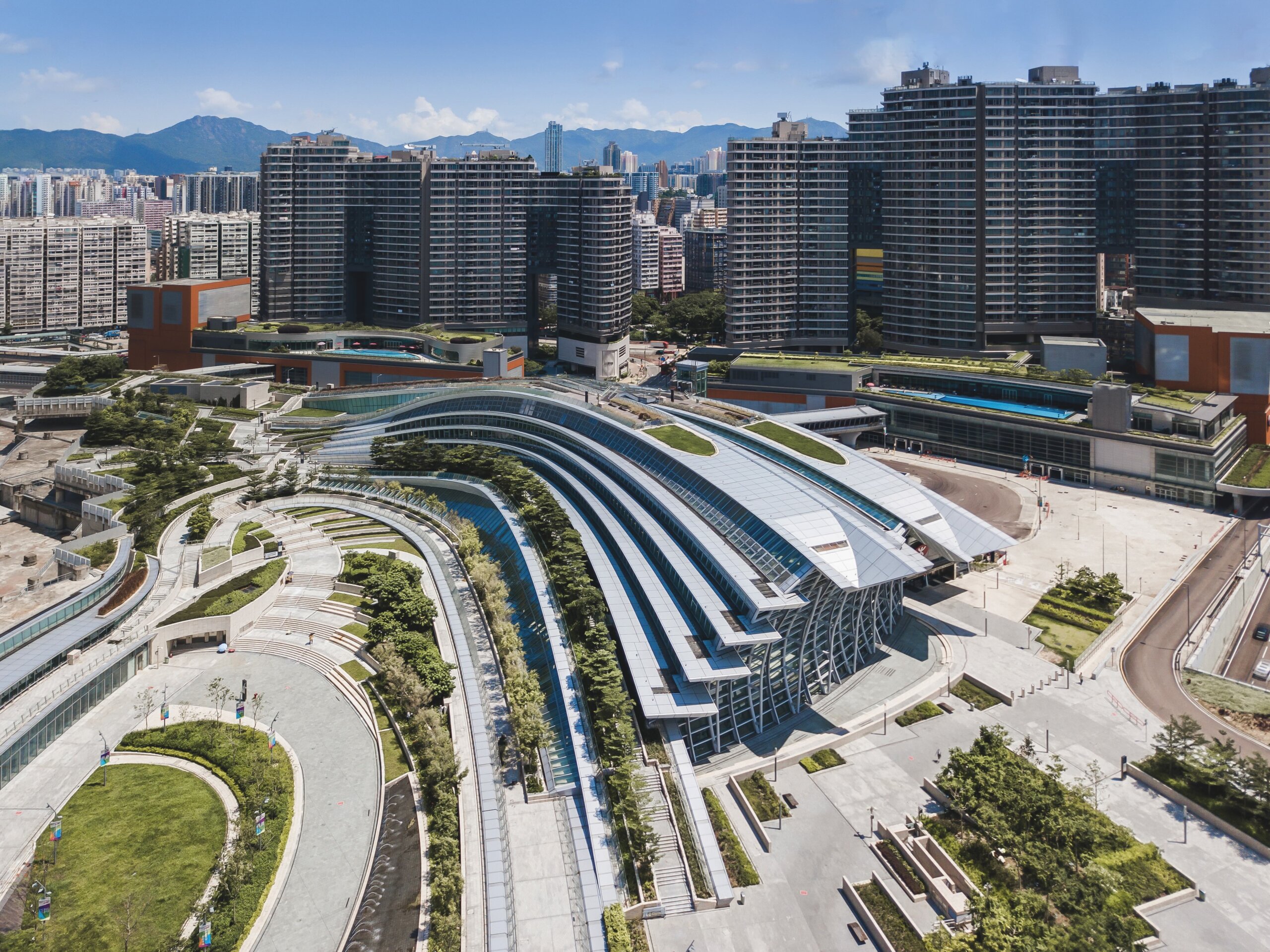 West Kowloon Station’s curved building blends seamlessly into the urban high-rise environment of the Kowloon Peninsula in Hong Kong.