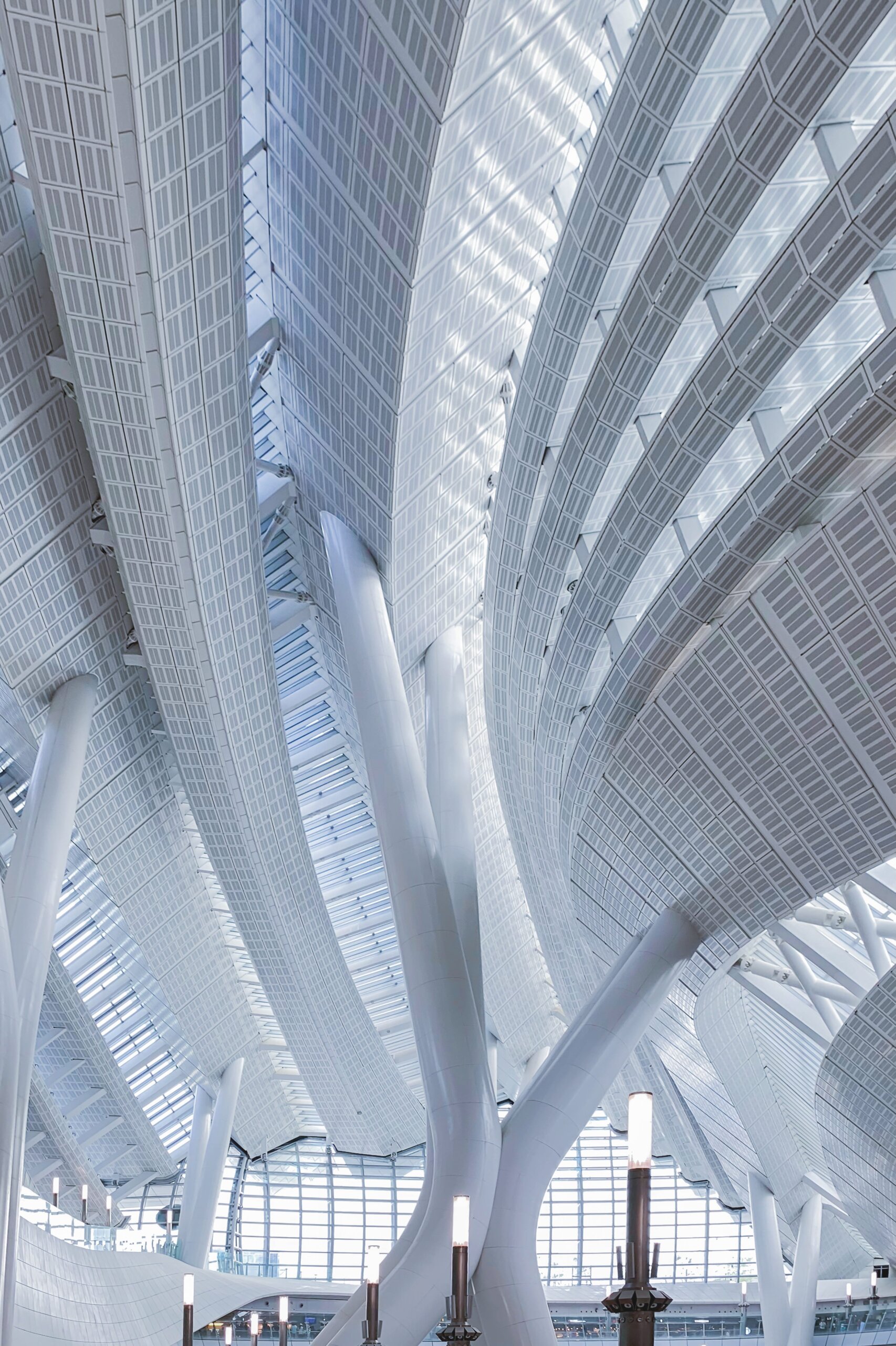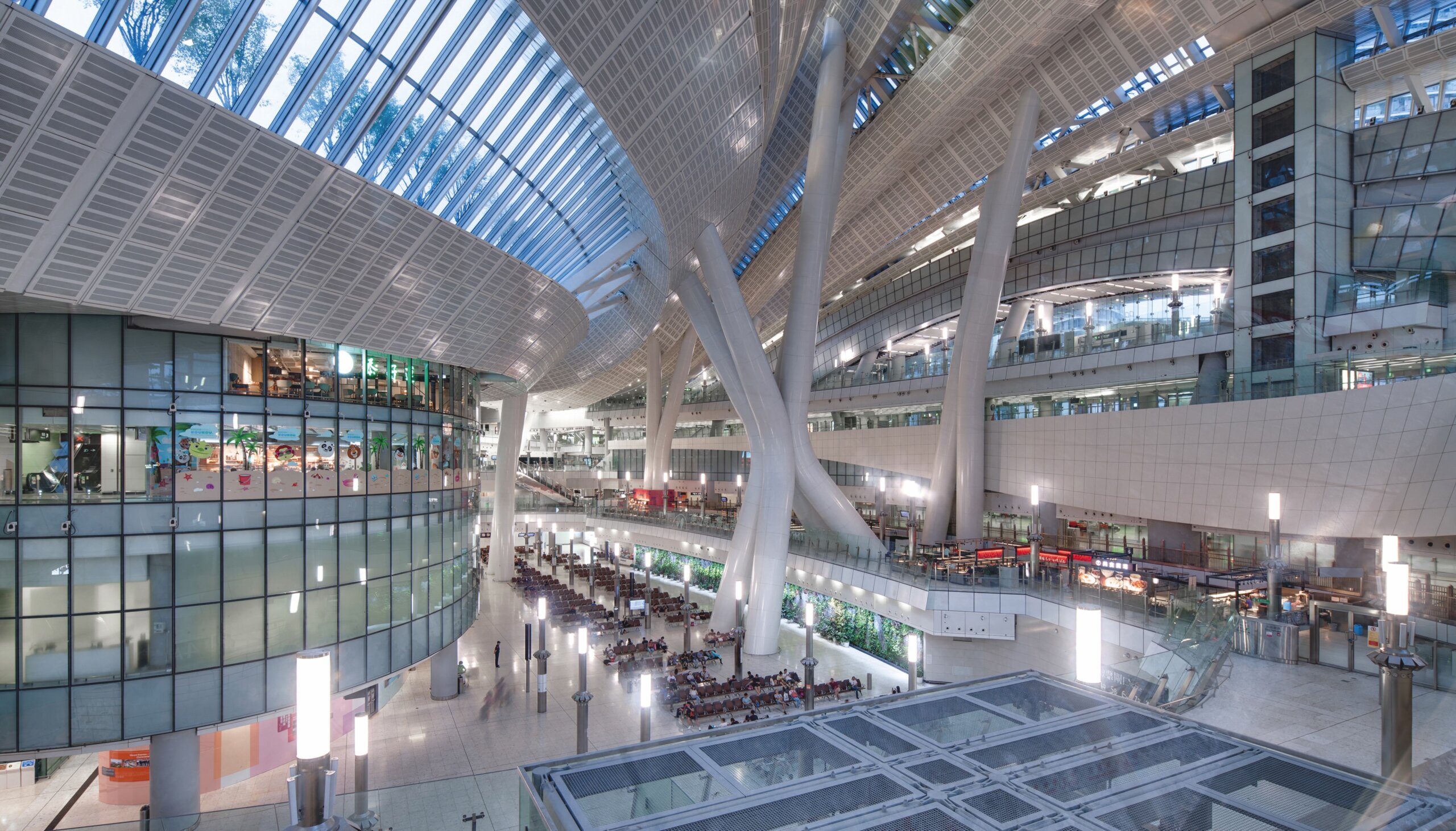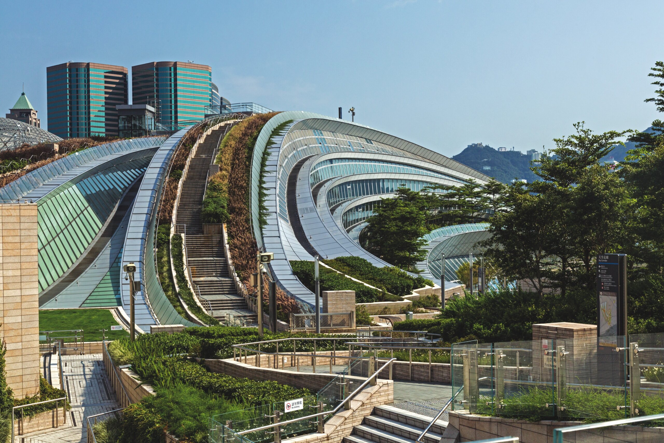 Large glass walls welcome arriving passengers and the south façade offers stunning views of Hong Kong’s spectacular harbour and skyline. Approximately three hectares of public space open up the station above ground via the Green Plaza and the Sky Corridor. The curved roof bends down to street level at one end of the building, enabling travellers to walk on and over the station.